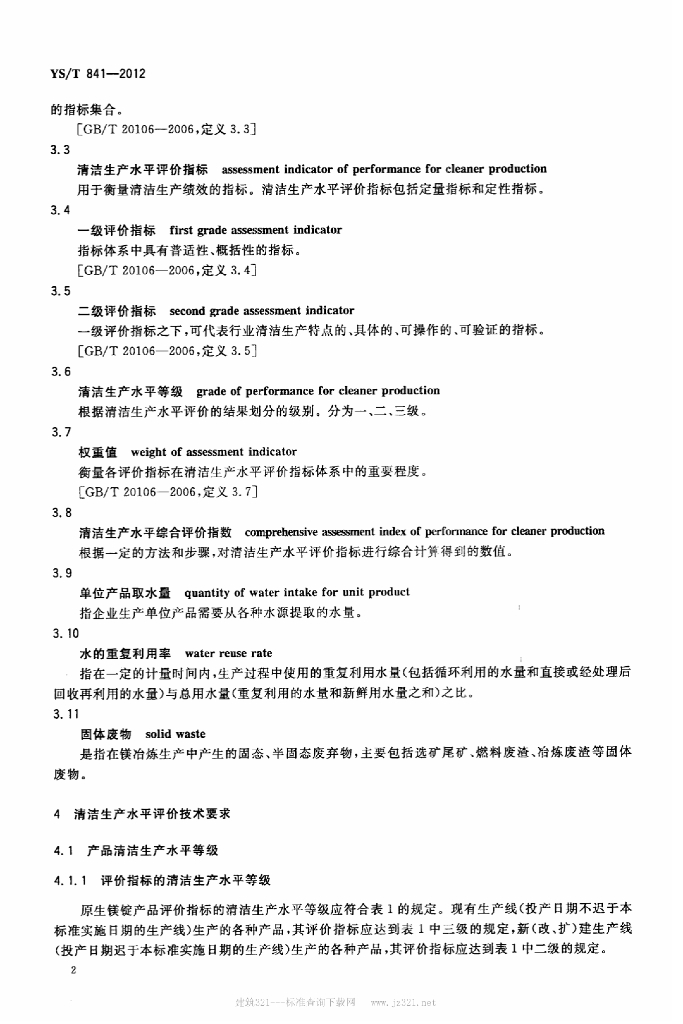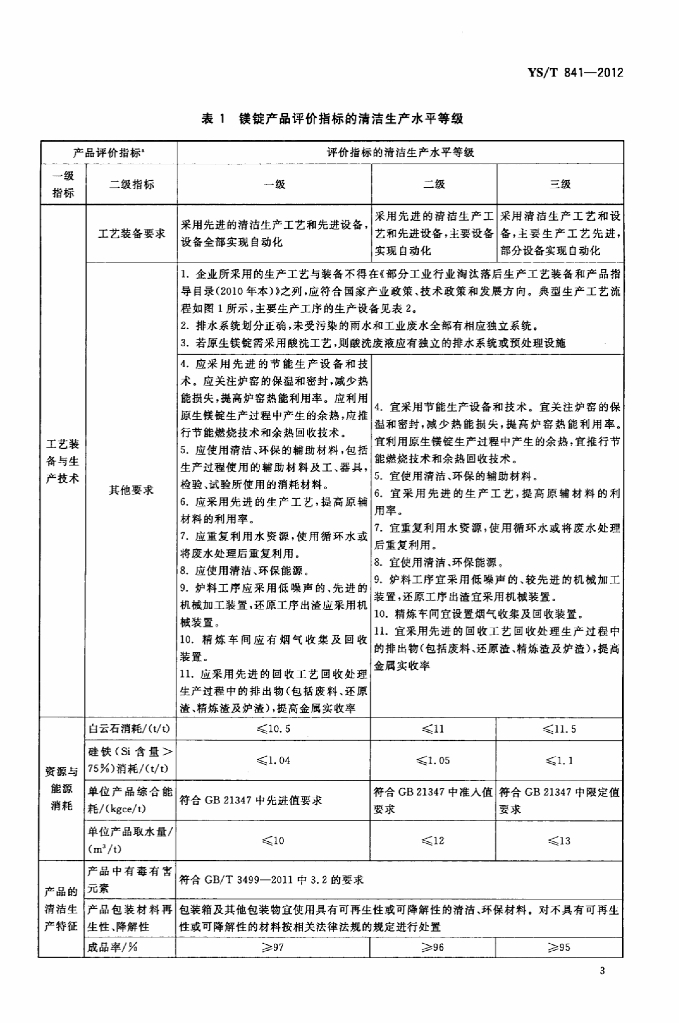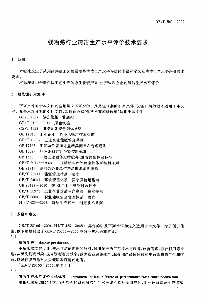 YS/T 841-2012 镁冶炼行业清洁生产水平评价技术要求