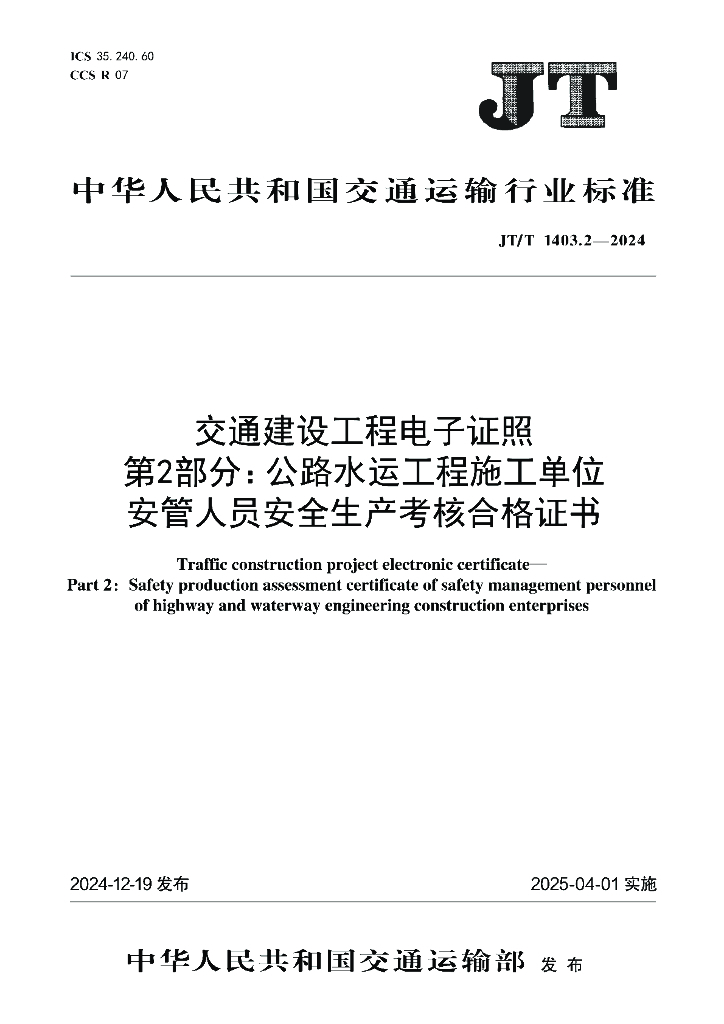 JT/T 1403.2-2024 交通建设工程电子证照 第2部分:公路水运工程施工单位安管人员安全生产考核合格证书