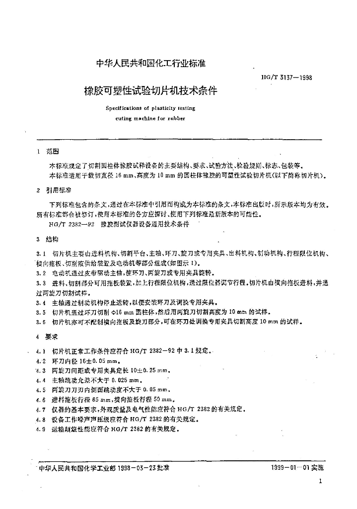 HG/T 3137-1998 橡胶可塑性试验切片机技术条件