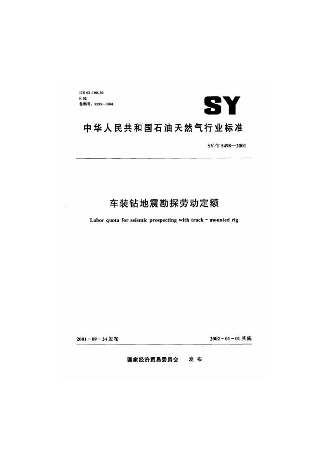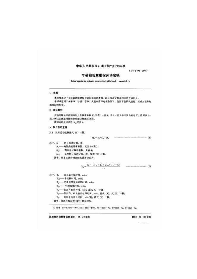 SY 5498-1992 平原区车装钻地震勘探劳动定额