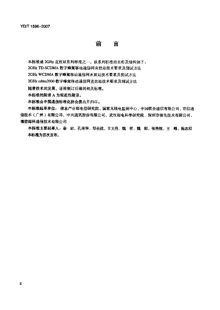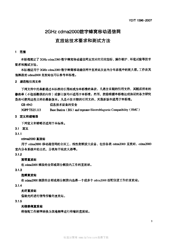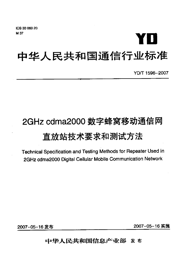 YD/T 1596-2007 2GHz cdma2000 数字蜂窝移动通信网直放站技术要求和测试方法