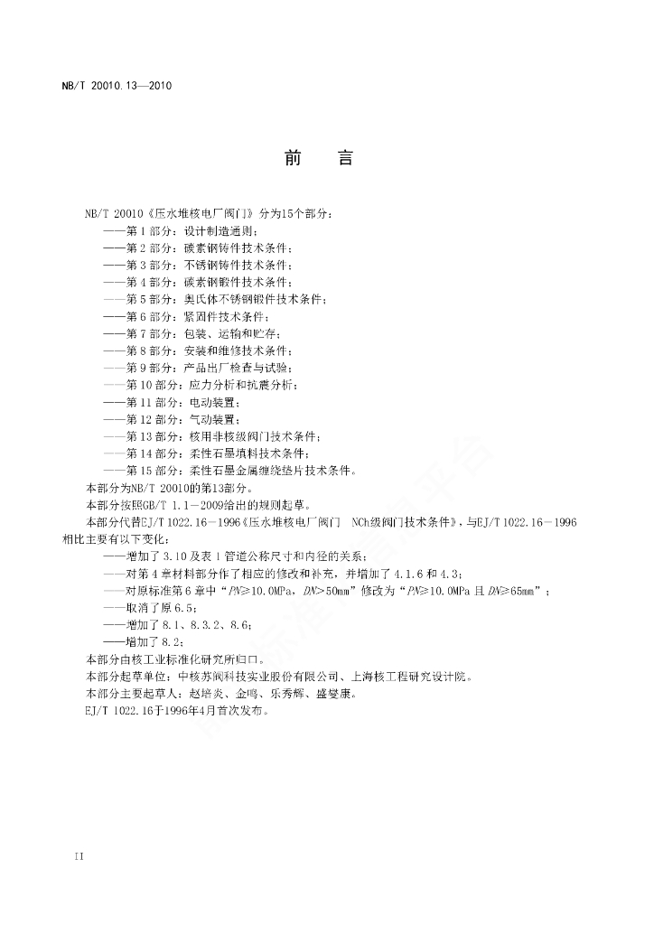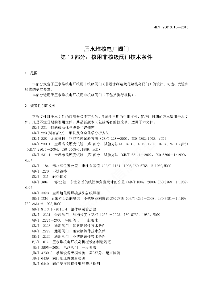 NB/T 20010.13-2010 压水堆核电厂阀门 第13部分:核用非核级阀门技术条件