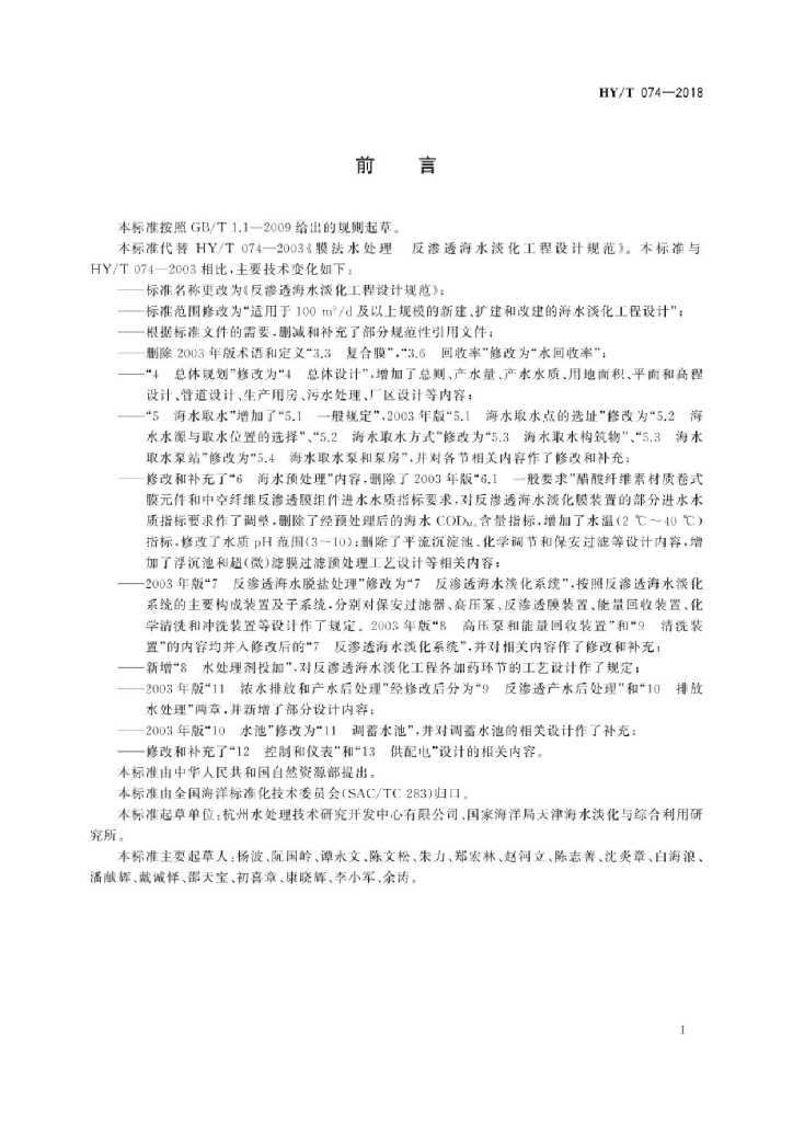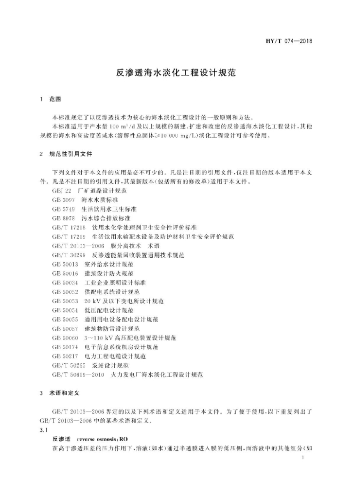 HY/T 074-2018 反渗透海水淡化工程设计规范