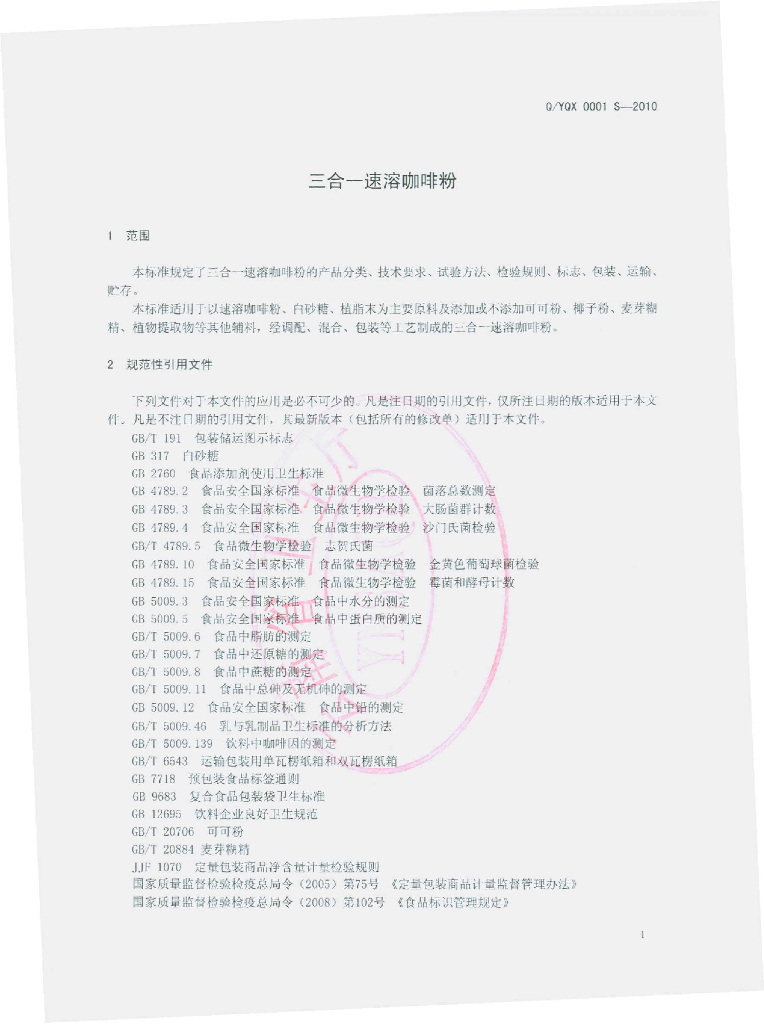 Q/YQX 0001S-2010 三合一速溶咖啡粉
