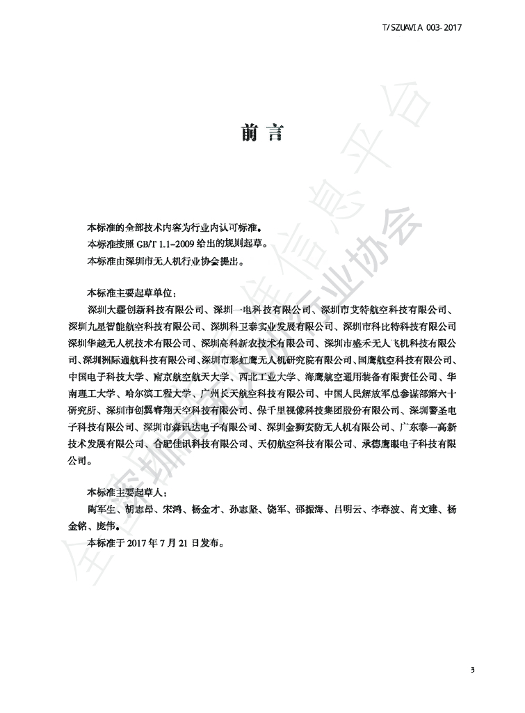 深圳大疆创新科技有限公司、深圳电科技有限公司、深圳市艾特航空科技有限公司、深圳九是智能航绢科技有限公司、深圳科卫泰实业发展有限公司、深圳市科比特科技有限公司、深圳华越元人机技术有限公司、深圳高科新农技术有限公司、深圳市盛禾元人飞机科技有限公司、深圳酬际通航科技有限公司、深圳市彩虹鹰元人机研究院有限公司、同鹰航空科技有限公司、中国电子科技大学、南京航空航天大学、商北工业大学、海鹰航空通用装备有限责任公司、华南理工大学、哈尔滨工程大学、广州伏天航空科技有限公司、中国人民解放军总参谋部第六十研究所、深圳市创翼睿