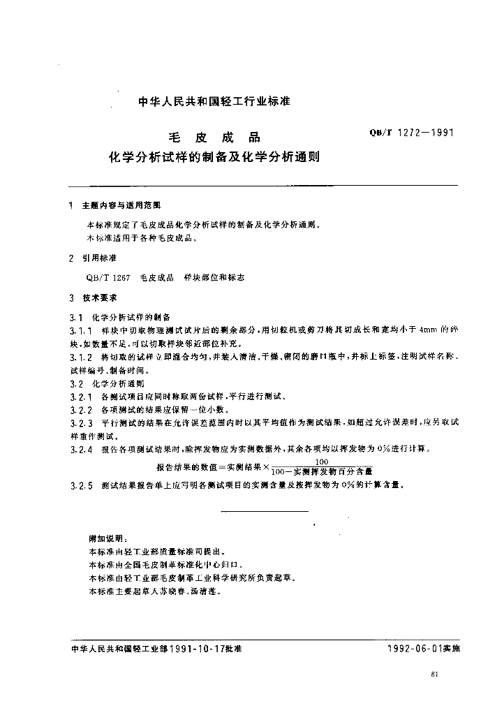 QB/T 1272-1991 毛皮成品化学分析试样的制备及化学分析通则