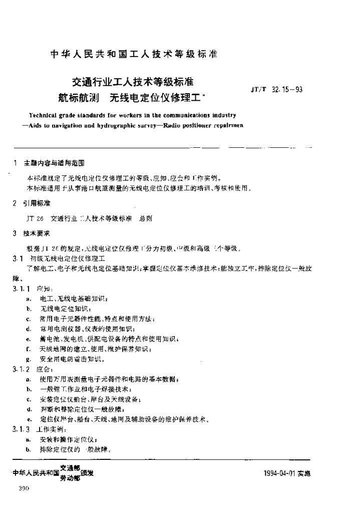 JT/T 32.15-1993 交通行业工人技术等级标准航标航测无线电定 位仪修理工