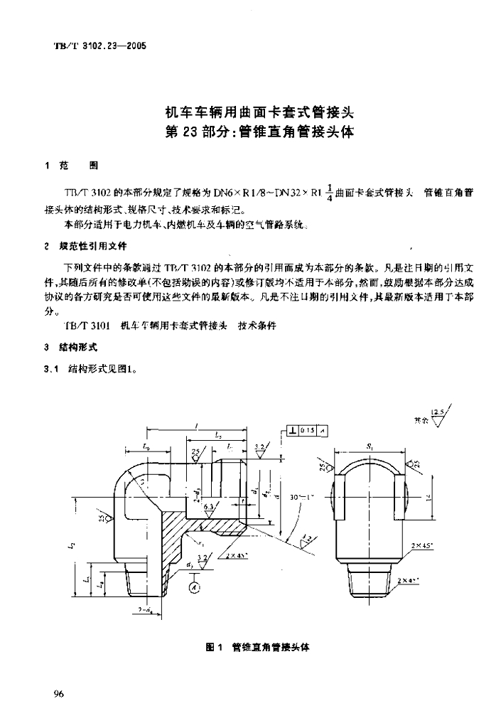 TB/T 3102.23-2005 机车车辆用曲面卡套式管接头 第23部分:管锥直角管接头体