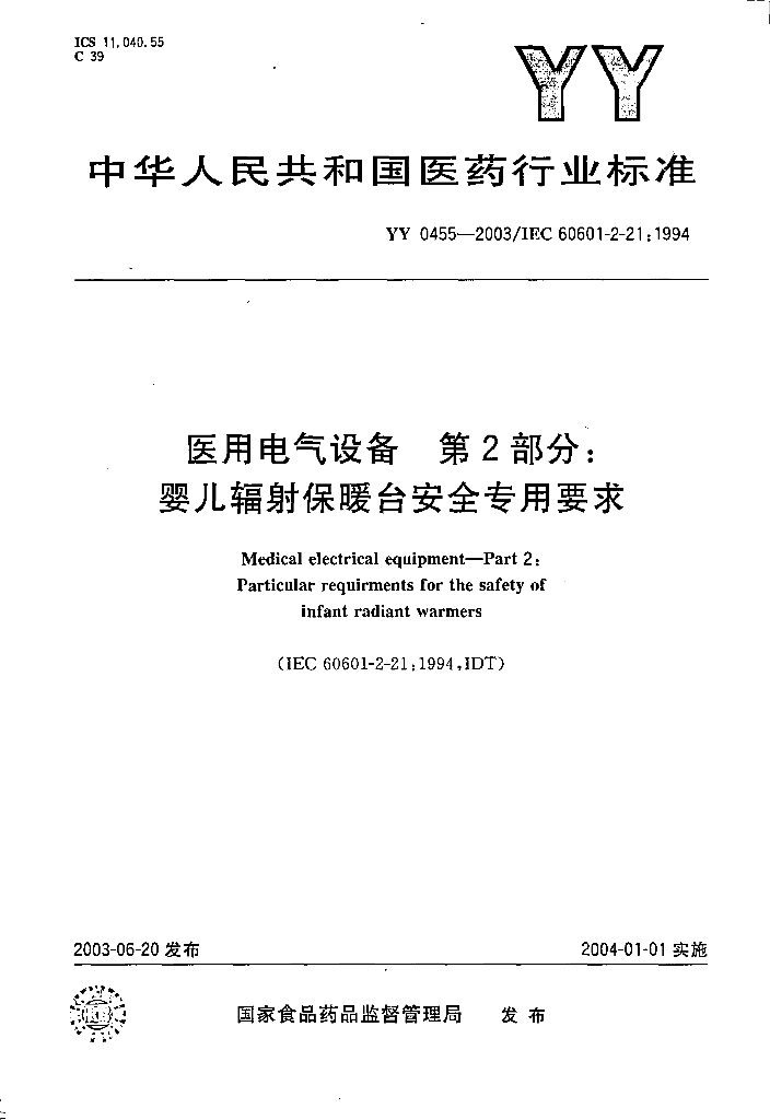 YY 0455-2003 医用电气设备 第2部分:婴儿辐射保暖台安全专用要求