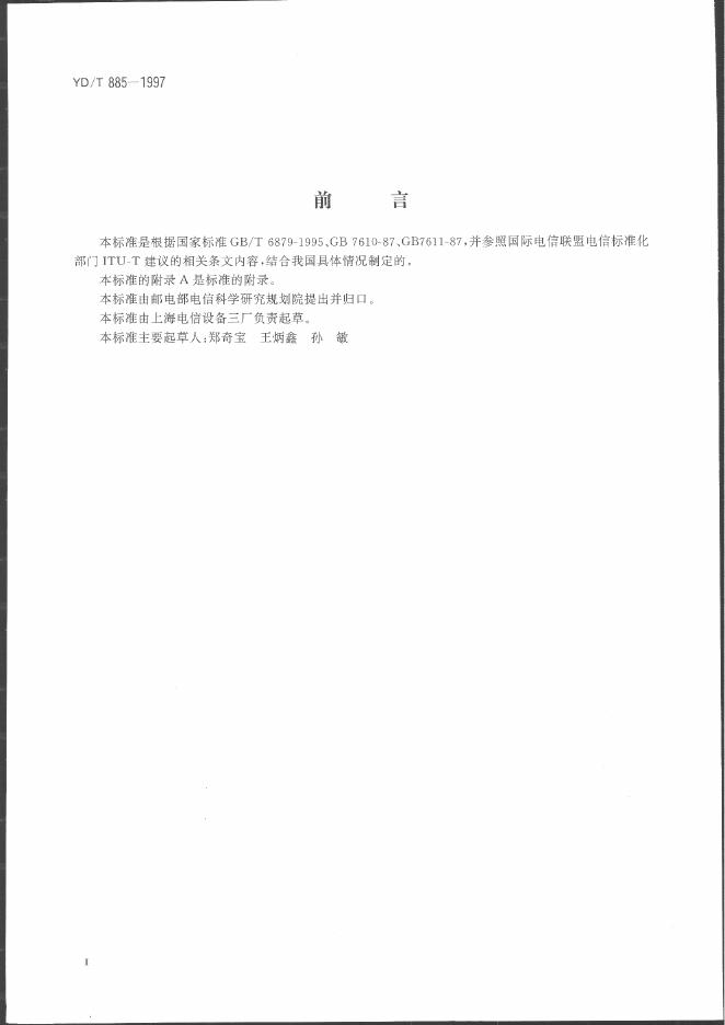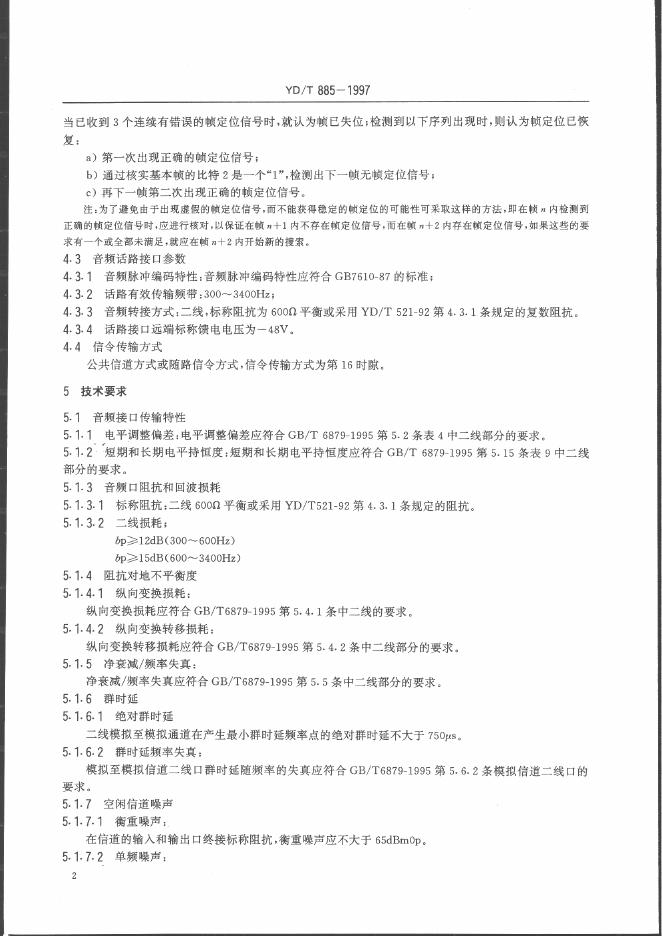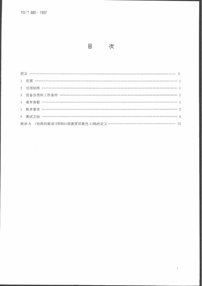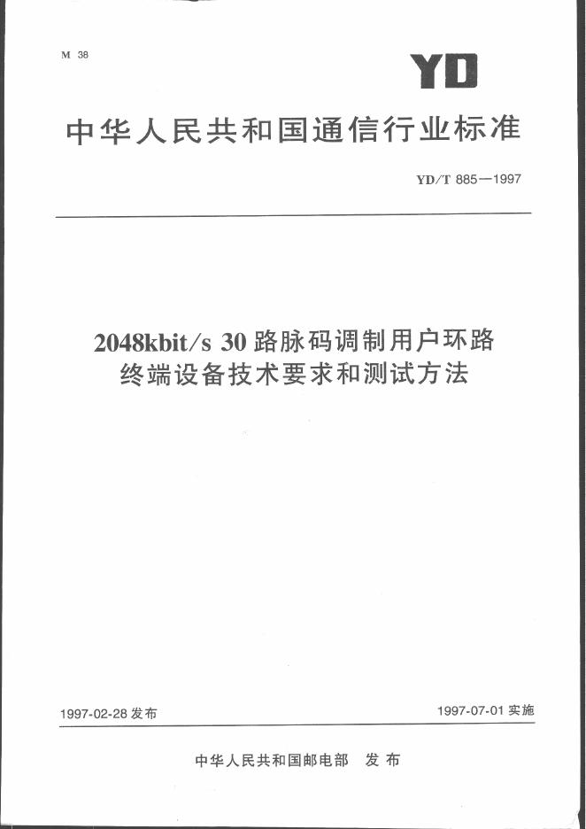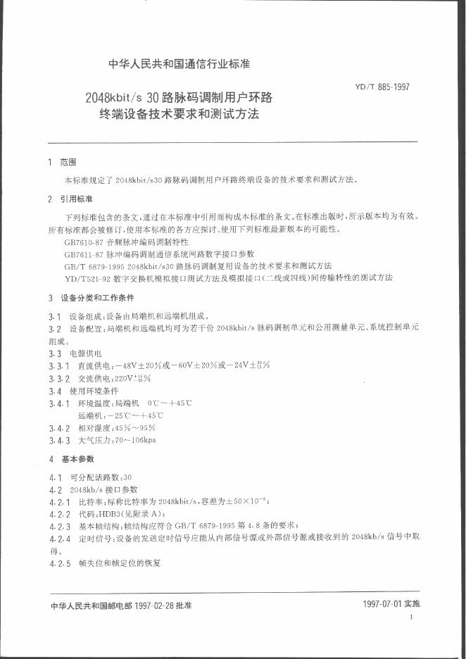 YD/T 885-1997 2048kbit/s 30路脉码调制用户环路终端设备技术要求和测试方法