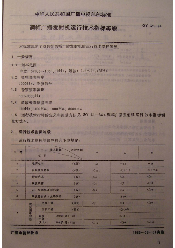 GY 32-1984 调幅广播发射机运行技术指标等级