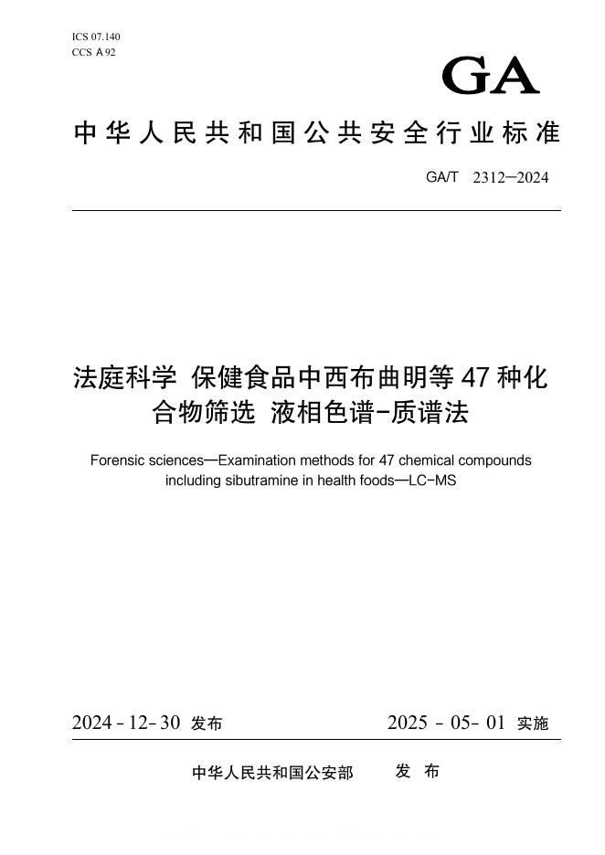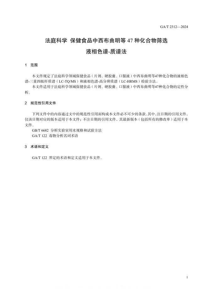 GA/T 2312-2024 法庭科学 保健食品中西布曲明等47种化合物筛选 液相色谱-质谱法(摘要版)