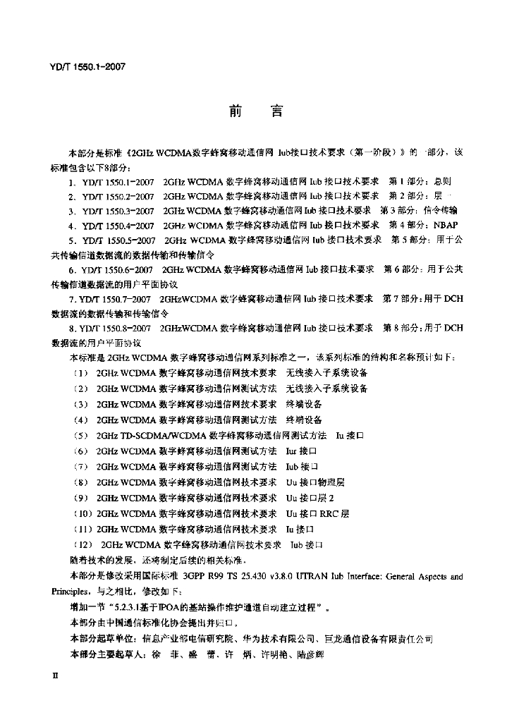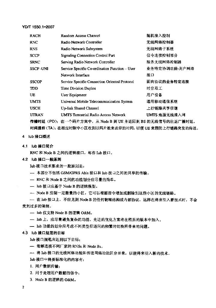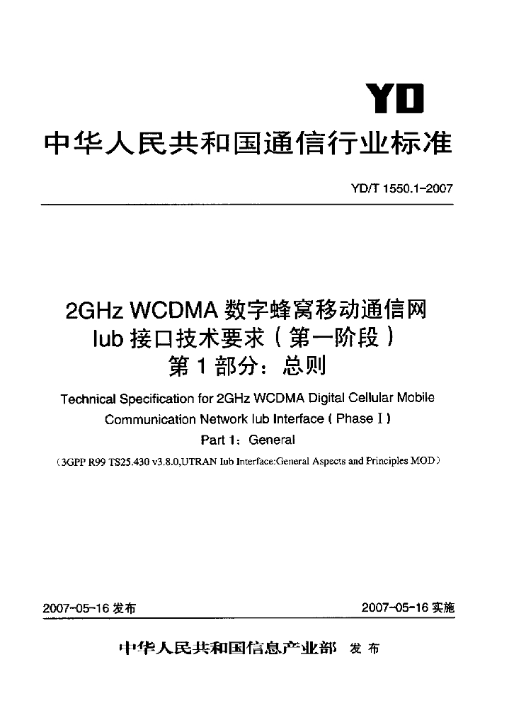 YD/T 1550.1-2007 2GHz WCDMA 数字蜂窝移动通信网 lub 接口技术要求(第一阶段) 第1部分:总则