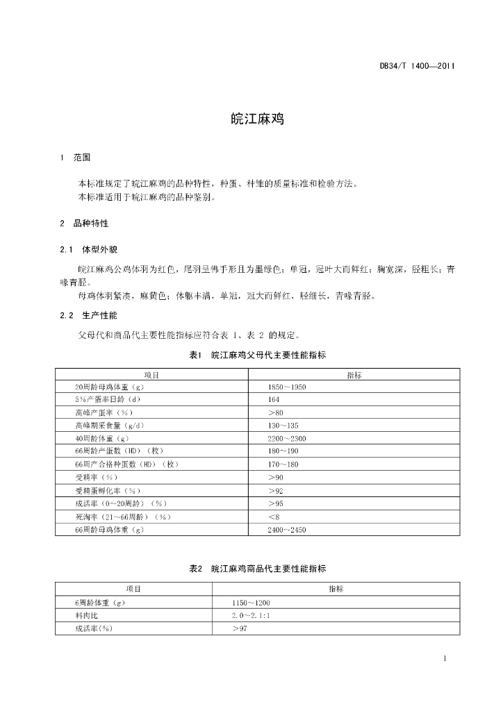 DB34/T 1400-2011 皖江麻鸡