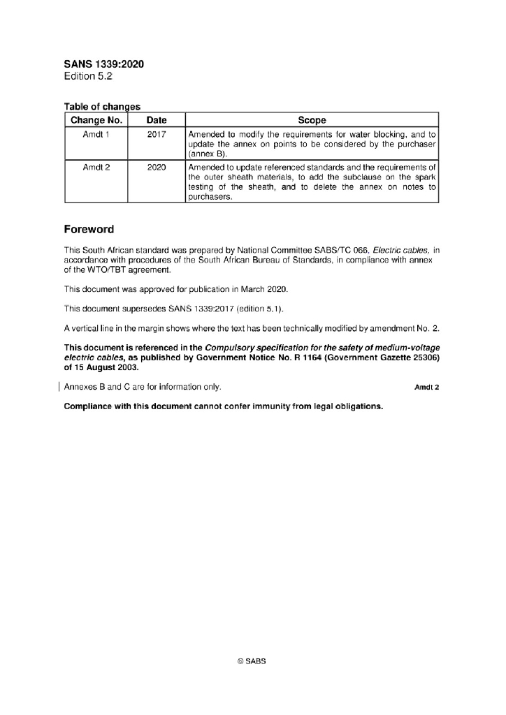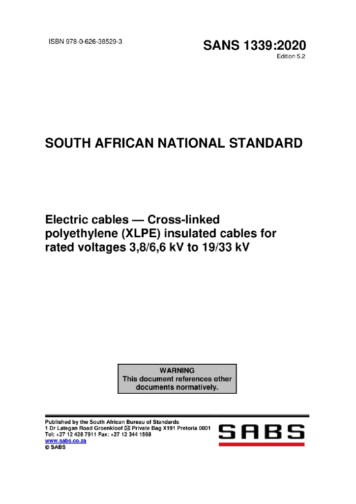 SANS 1339:2020 电缆-额定电压3.8 6.6kV至19 33kV交联聚乙烯(XLPE)绝缘电缆