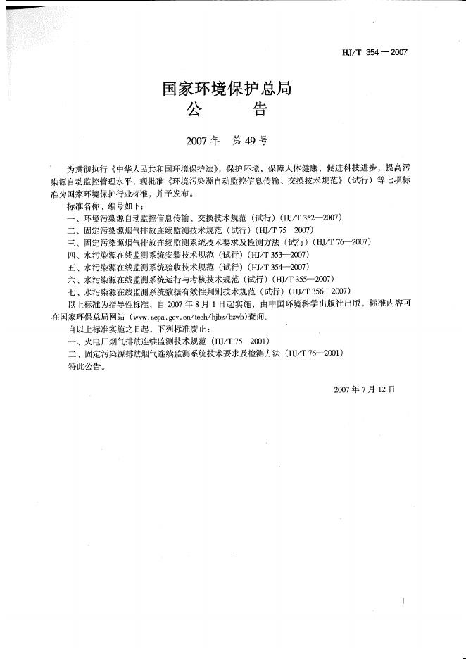 HJ/T 354-2007 水污染源在线监测系统验收技术规范(试行)