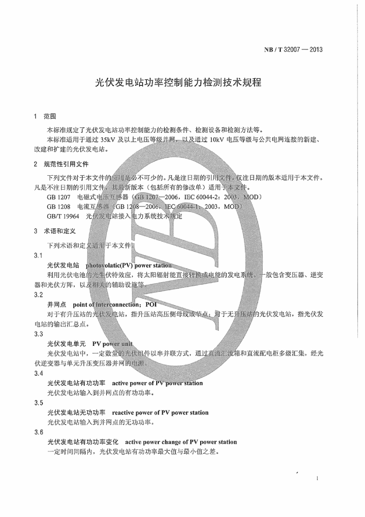 NB/T 32007-2013 光伏发电站功率控制能力检测技术规程