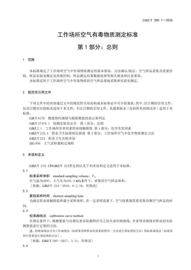 GBZ/T 300.1-2026 工作场所空气有毒物质测定标准 第1部分:总则