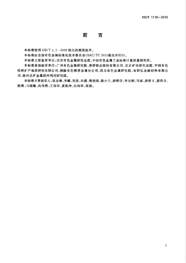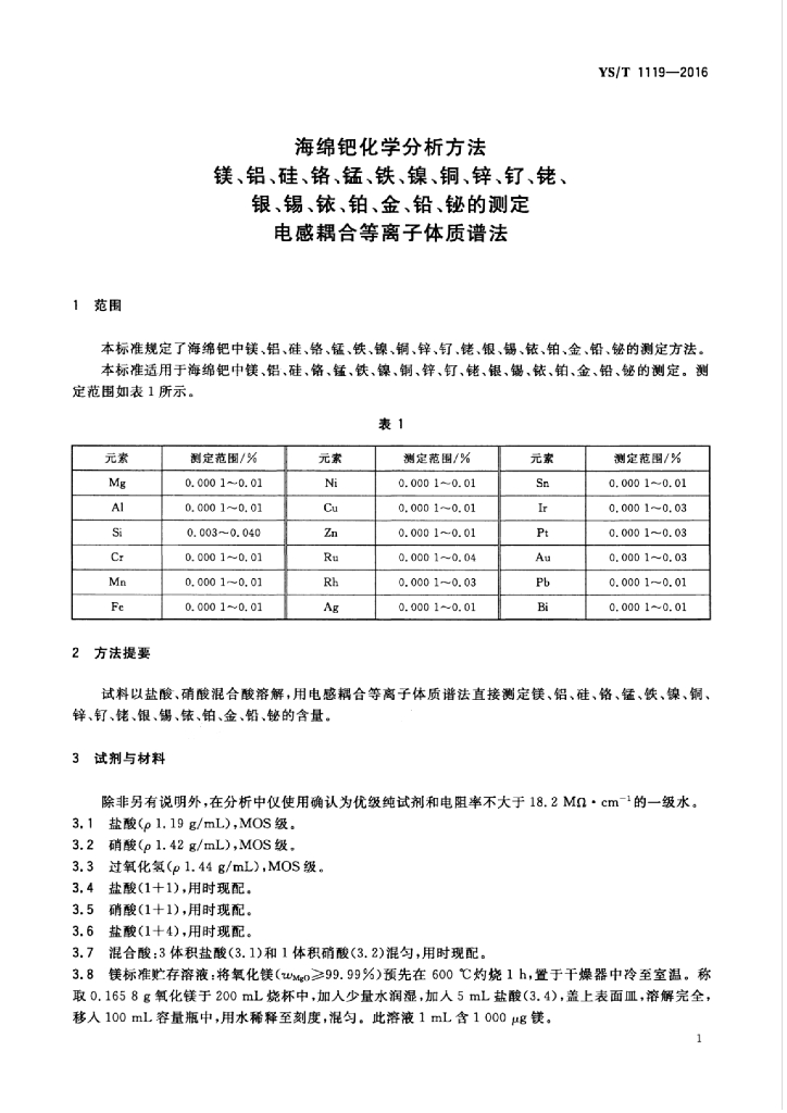 YS/T 1119-2016 海绵钯化学分析方法 镁、铝、硅、铬、锰、铁、镍、铜、锌、钌、铑、银、锡、铱、铂、金、铅、铋的测定 电感耦合等离子体质谱法