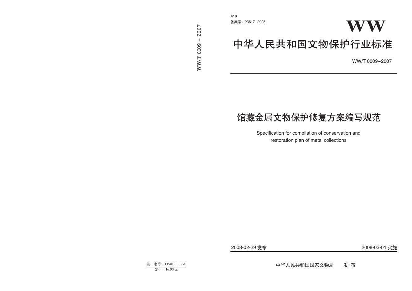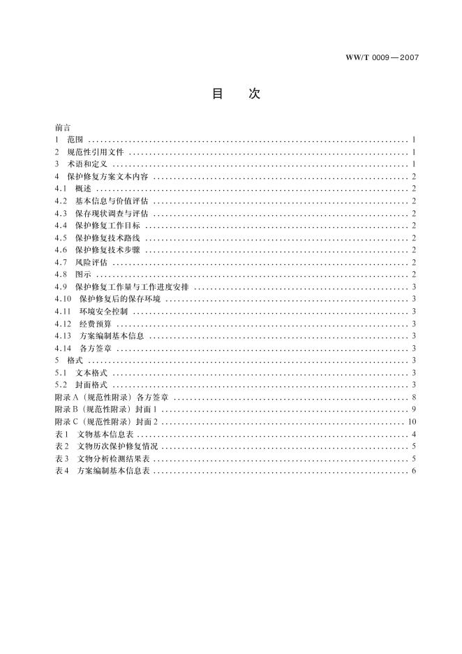 WW/T 0009-2007 馆藏金属文物保护修复方案编写规范