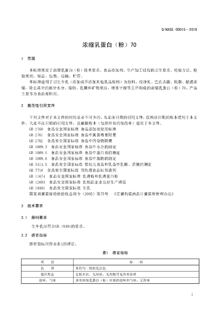 Q/NXSS 0001S-2018 浓缩乳蛋白(粉)70