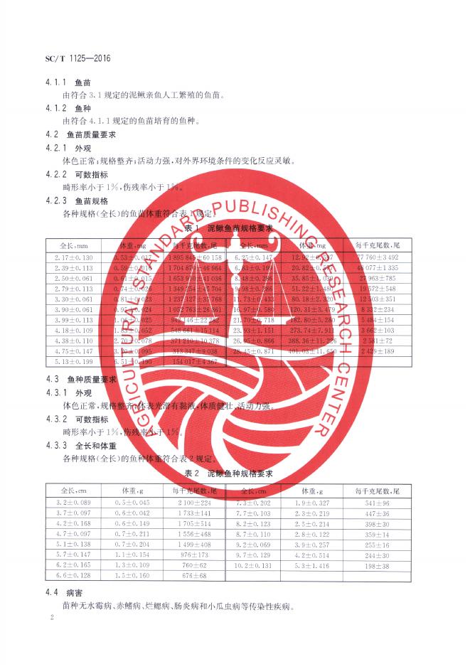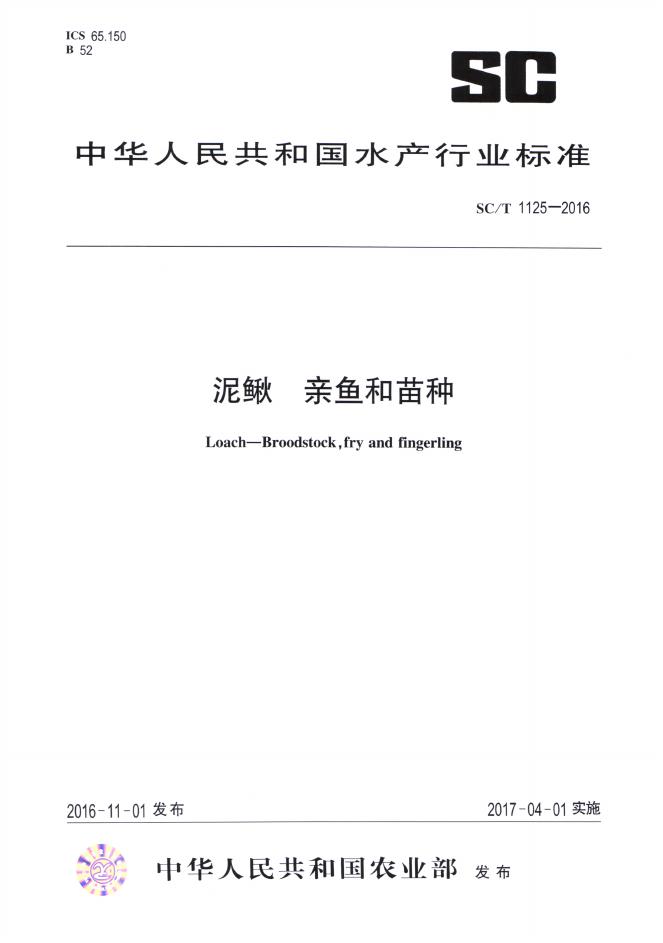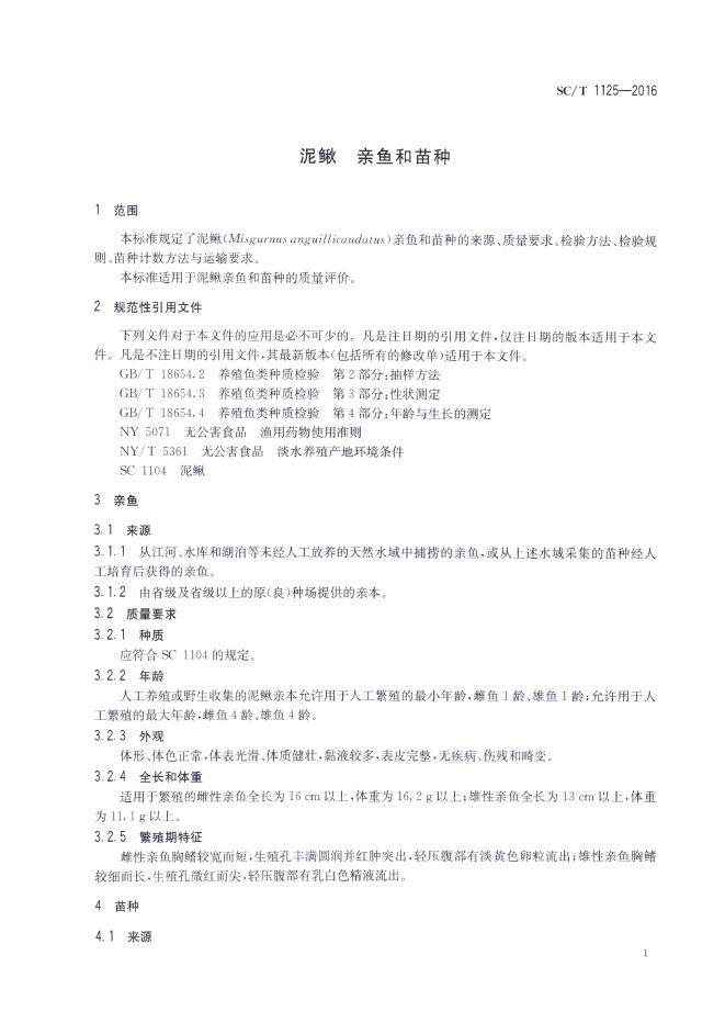 SC/T 1125-2016 泥鳅 亲鱼和苗种