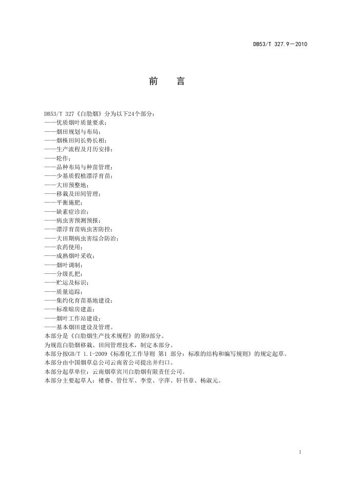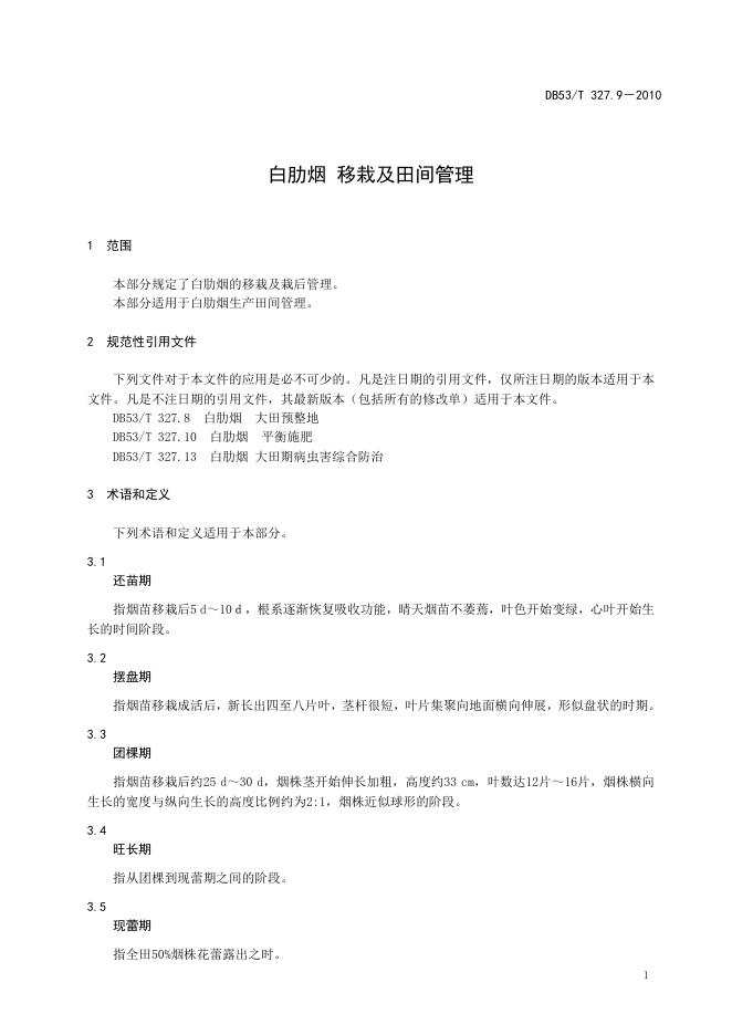 DB53/T 327.9-2010 白肋烟 移栽及田间管理