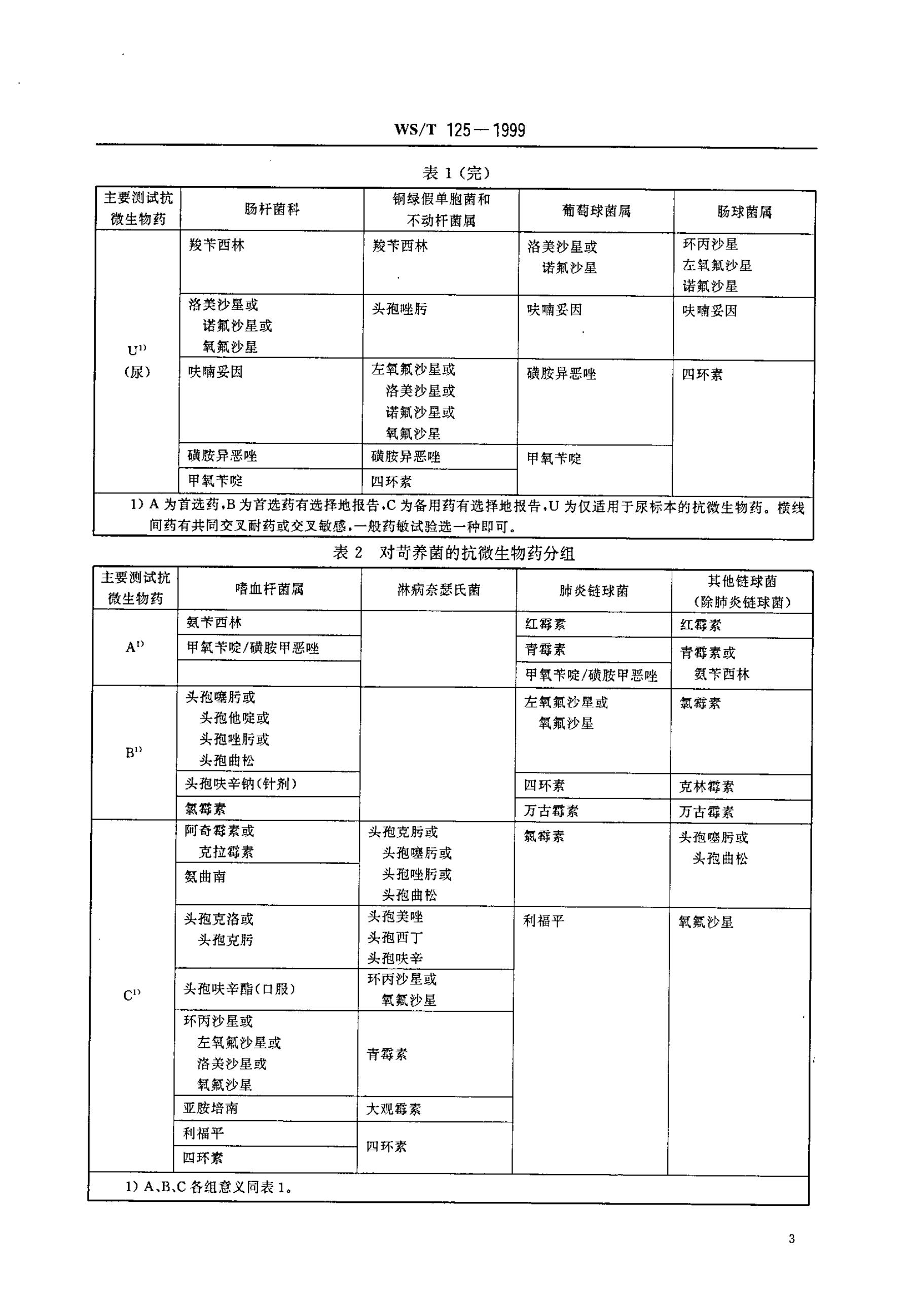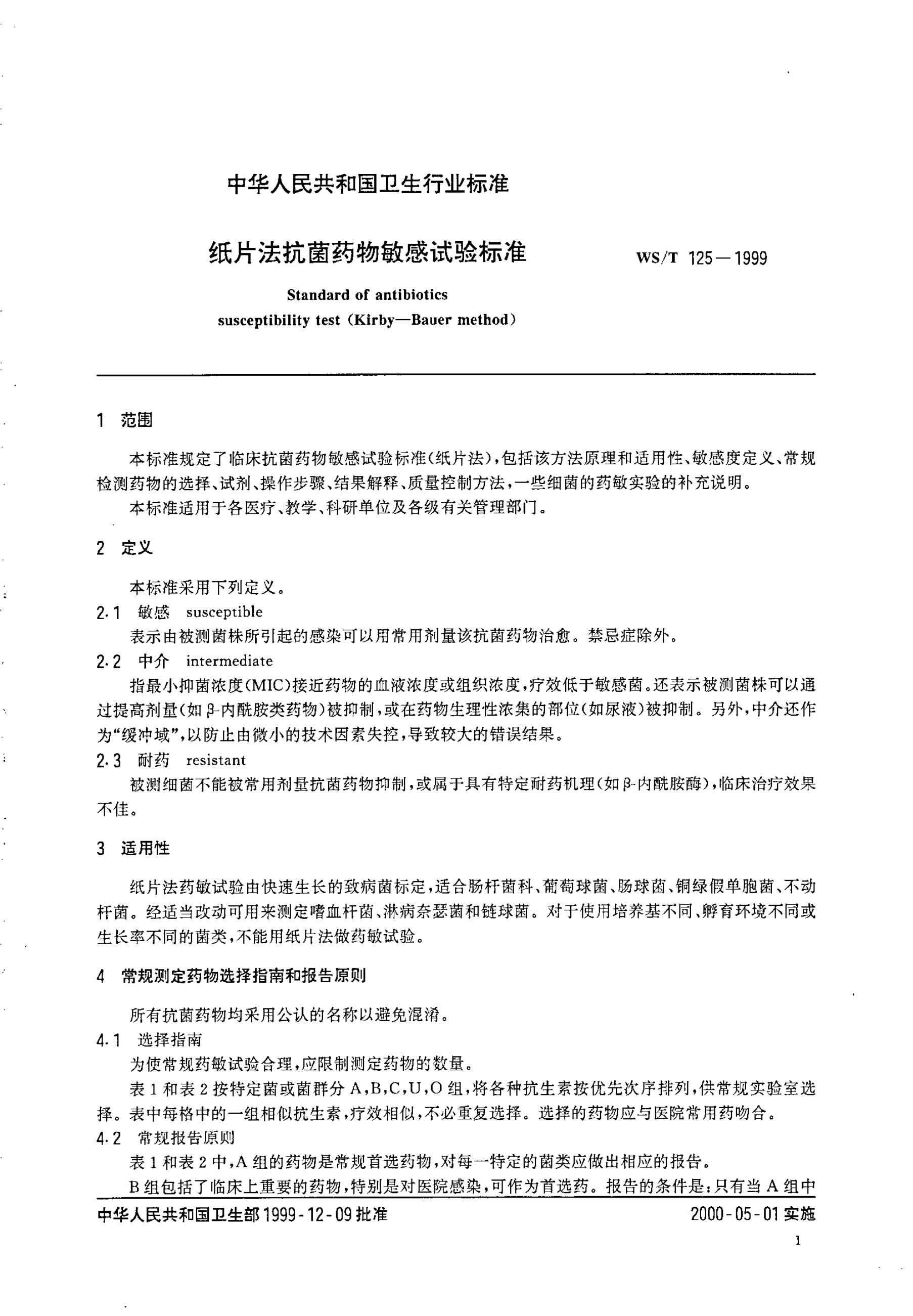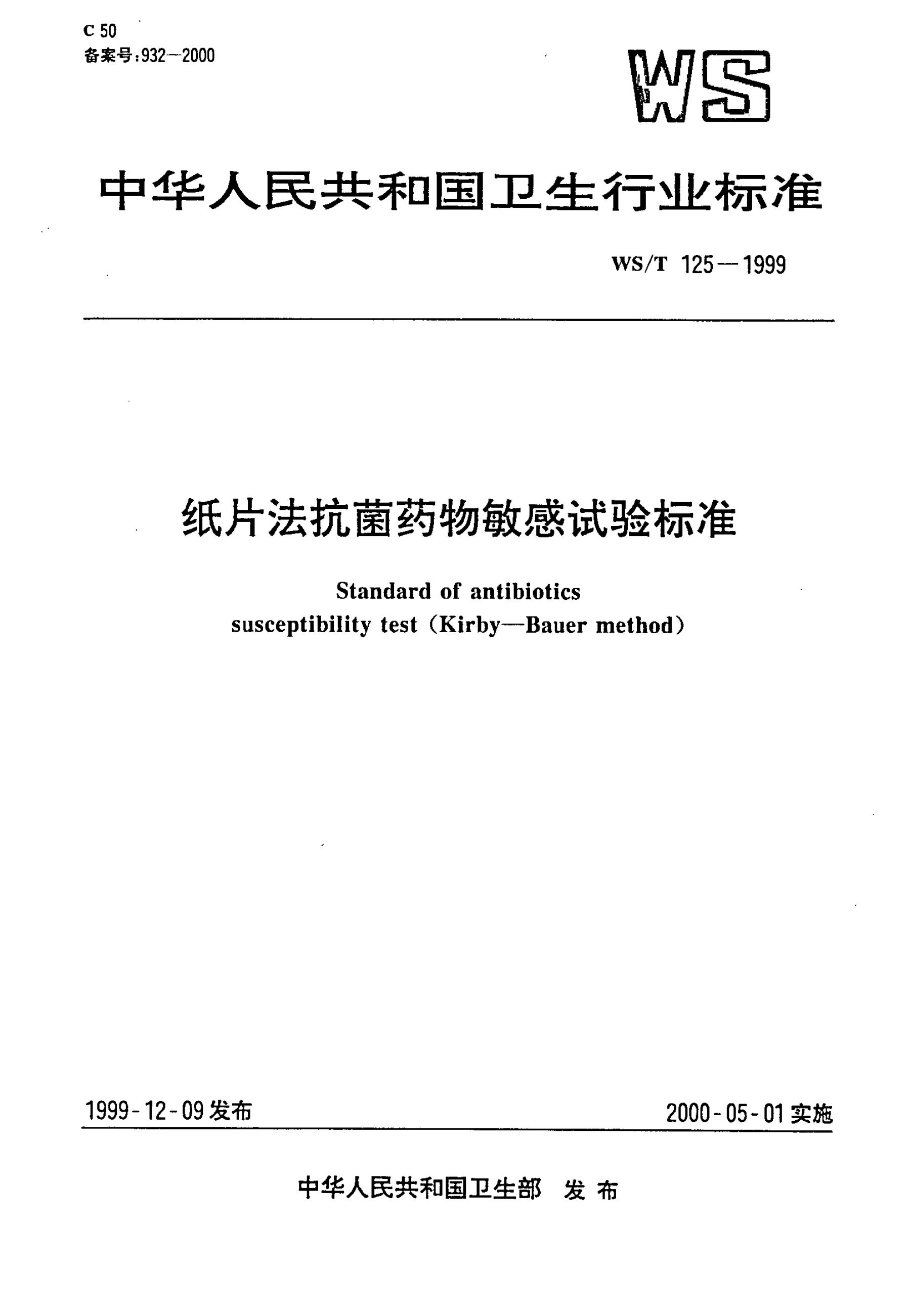 WS/T 125-1999 纸片法抗菌药物敏感试验标准