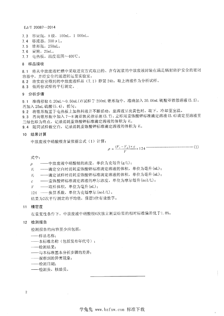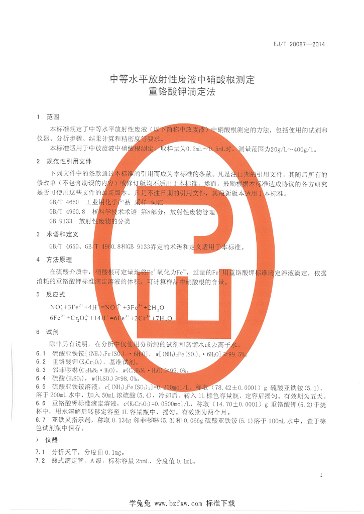 EJ/T 20087-2014 中等水平放射性废液中硝酸根测定重铬酸钾滴定法