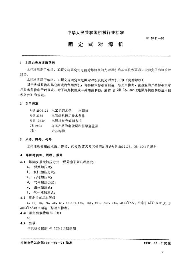 JB 5251-1991 固定式对焊机