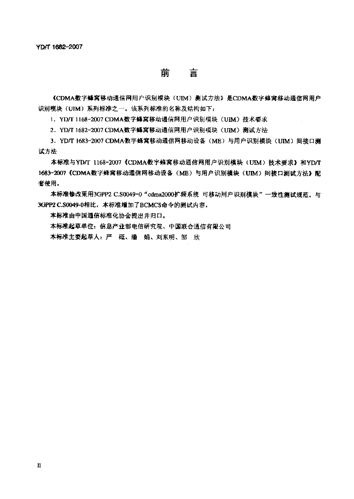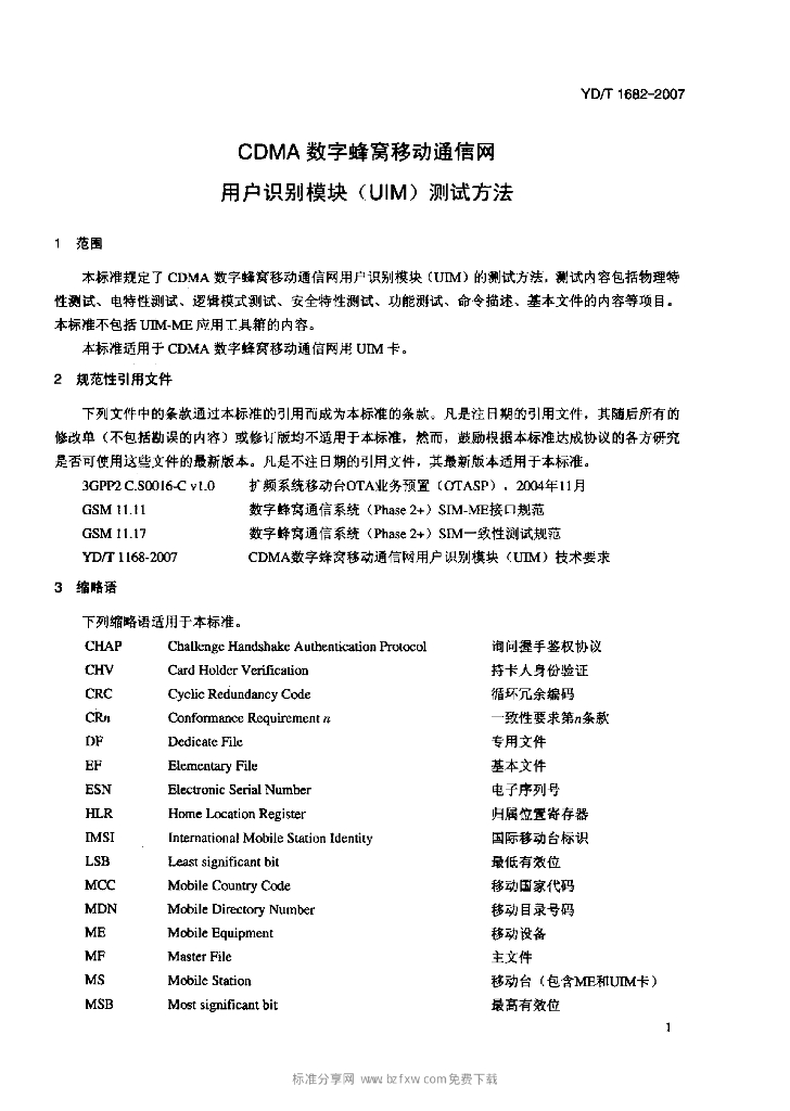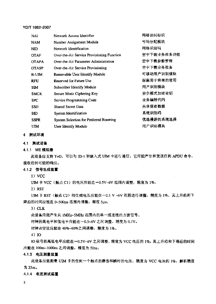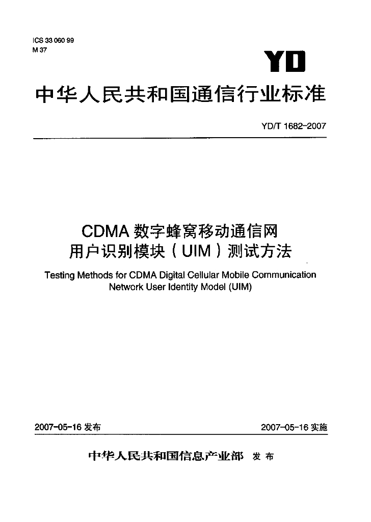YD/T 1682-2007 CDMA 数字蜂窝移动通信网用户识别模块(UIM)测试方法