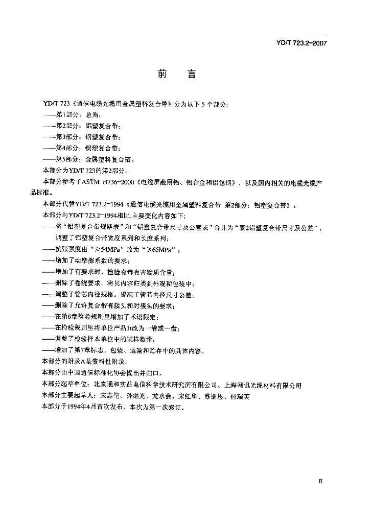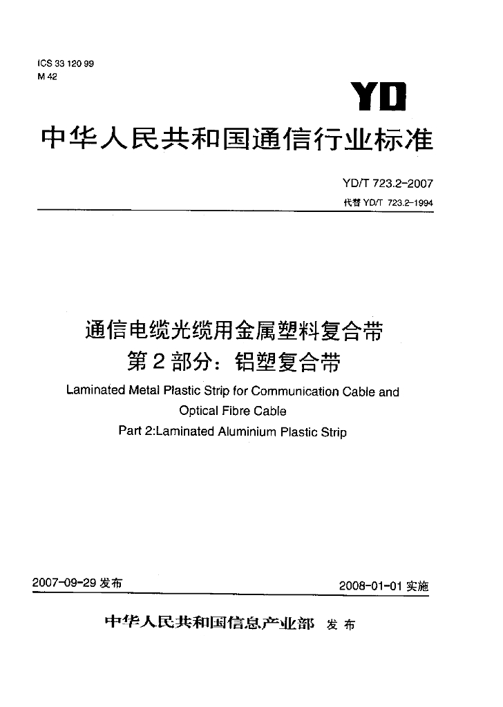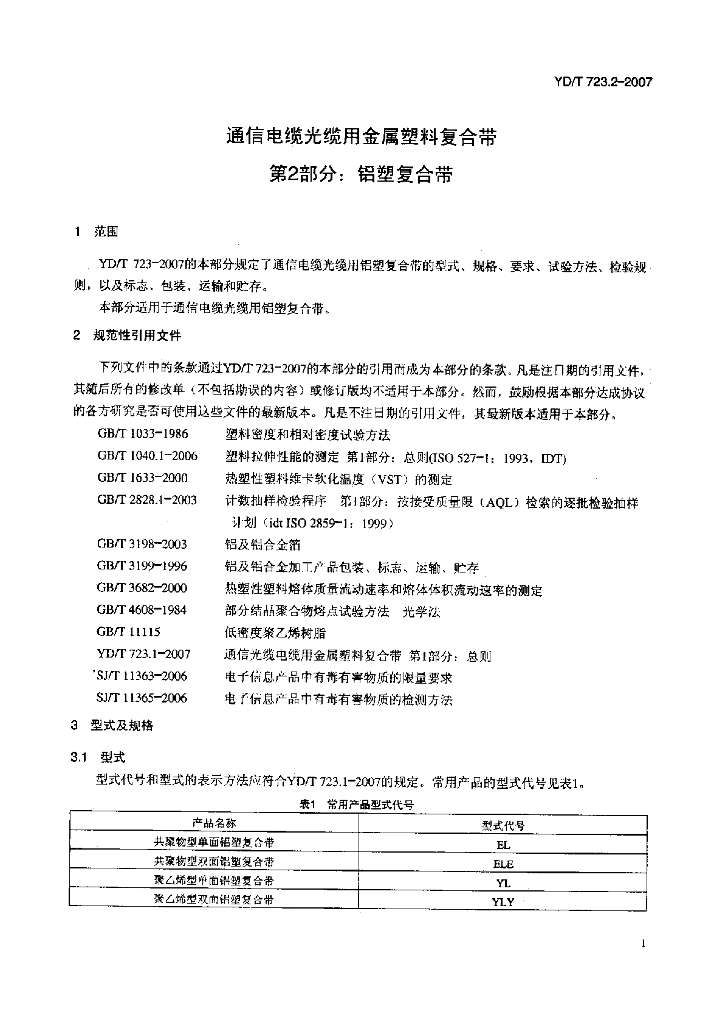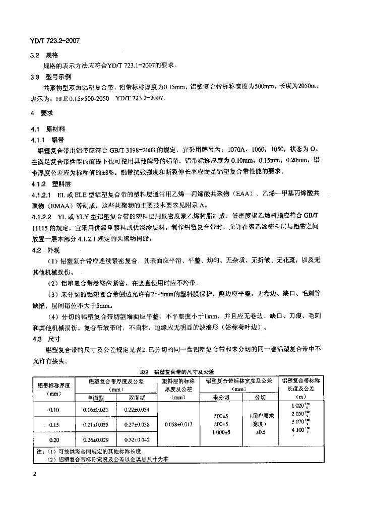 YD/T 723.2-2007 通信电缆光缆用金属塑料复合带 第2部分:铝塑复合带