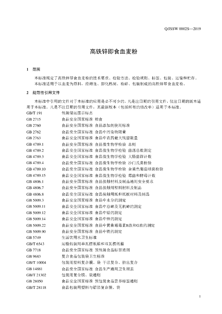 Q/JSSW 0002S-2019 高铁锌即食血麦粉