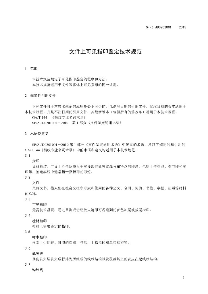 SF/Z JD0202001-2015 文件上可见指印鉴定技术规范
