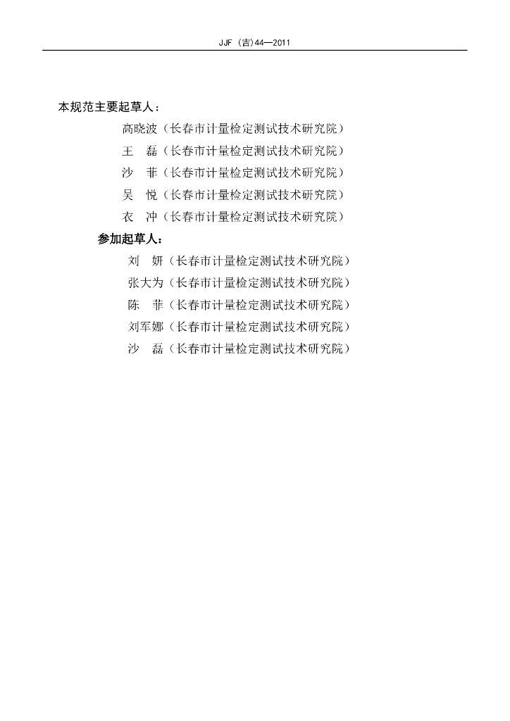 高晓波(长春市计量检定测试技术研究院)、王磊(长春市计量检定测试技术研究院)、沙菲(长春市计量检定测试技术研究院)、吴悦(长春市计量检定测试技术研究院)、衣冲(长春市计量检定测试技术研究院)、刘妍(长春市计量检定测试技术研究院)、张大为(长春市计量检定测试技术研究院)、陈菲(长春市计量检定测试技术研究院)、刘军娜(长春市计量检定测试技术研究院)、沙磊(长春市计量检定测试技术研究院)
