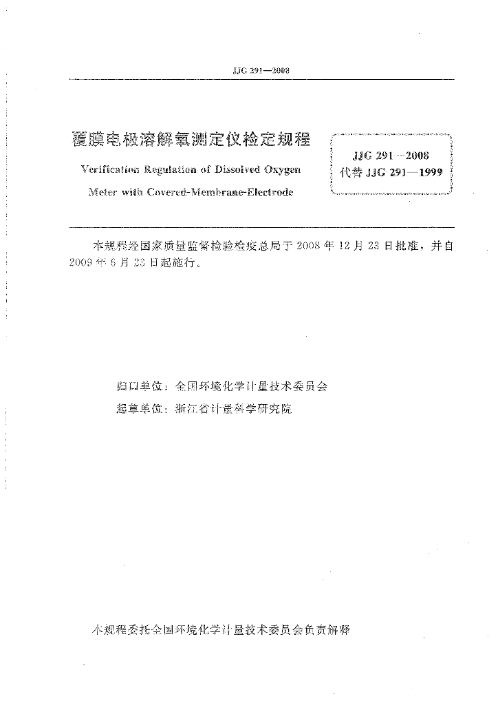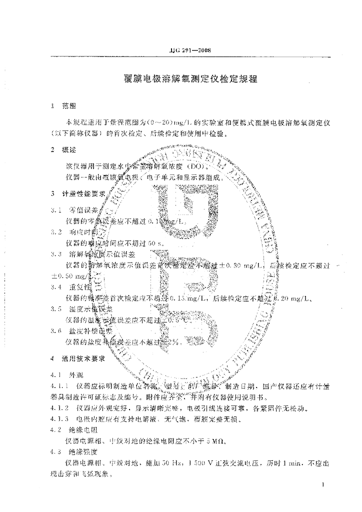 JJG 291-2008 覆膜电极溶解氧测定仪检定规程