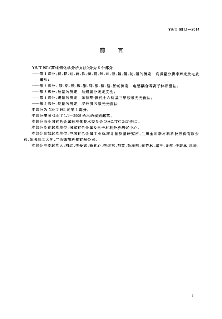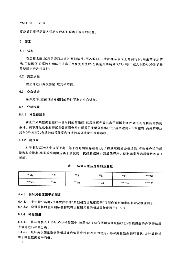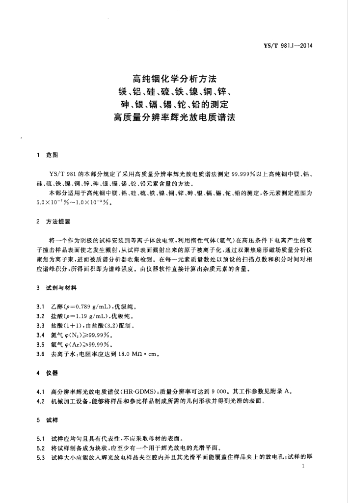 YS/T 981.1-2014 高纯铟化学分析方法镁、铝、硅、硫、铁、镍、铜、锌、砷、银、镉、锡、铊、铅的测定高质量分辨率辉光放电质谱法
