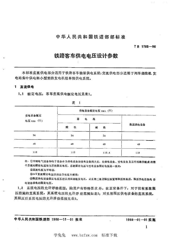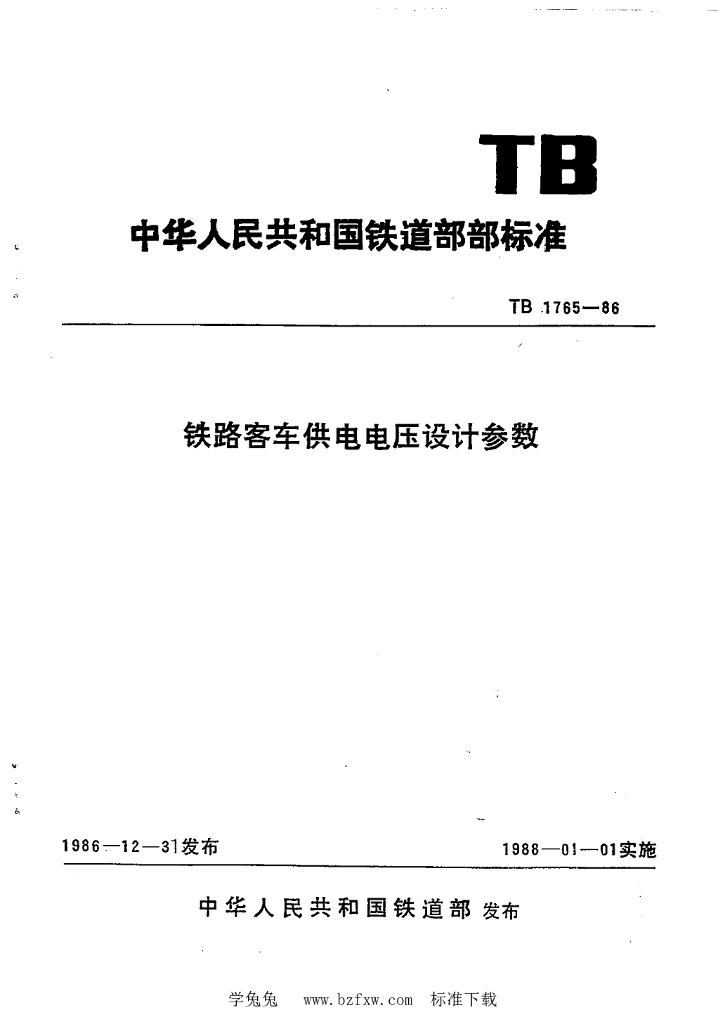 TB/T 1765-1986 铁路客车供电电压设计参数