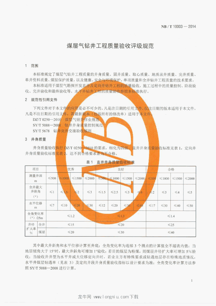 NB/T 10003-2014 煤层气钻井工程质量验收评级规范
