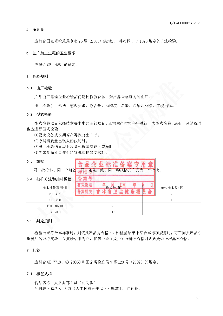 Q/CALL 0007S-2021 人参鹿茸血酒(配制酒)