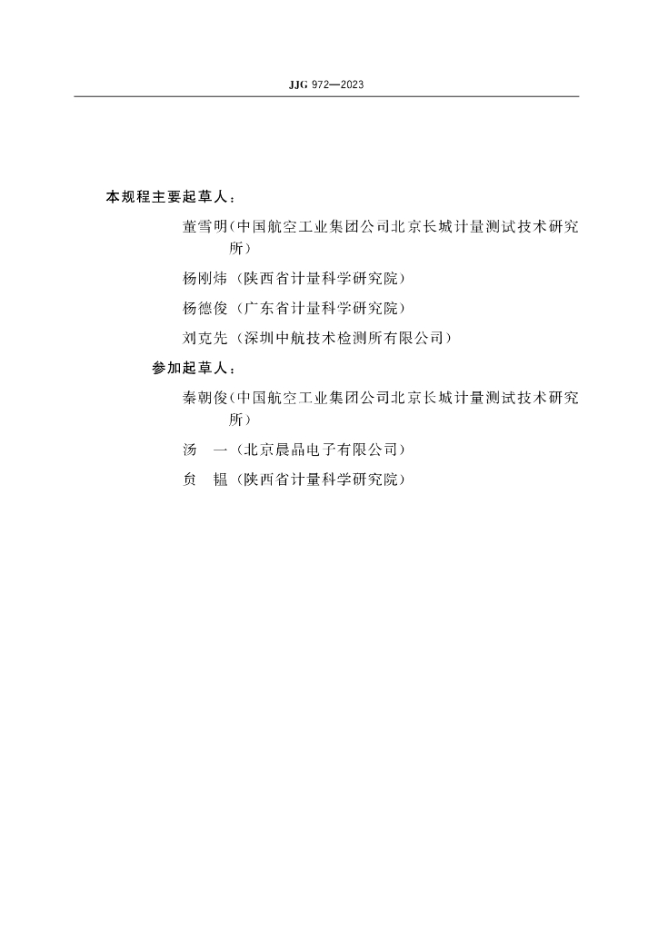 董雪明(中国航空工业集团公司北京长城计量测试技术研究所)、杨刚炜(陕西省计量科学研究院)、杨德俊(广东省计量科学研究院)、刘克先(深圳中航技术检测有限公司)、秦朝俊(中国航空工业集团公司北京长城计量测试技术研究所)、汤一(北京晨晶电子有限公司)、负韫(陕西省计量科学研究院)