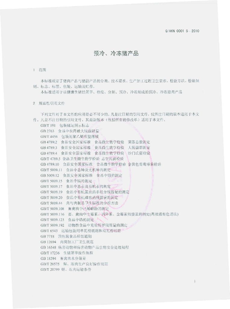 Q/AKN 0001S-2010 预冷、冷冻猪产品