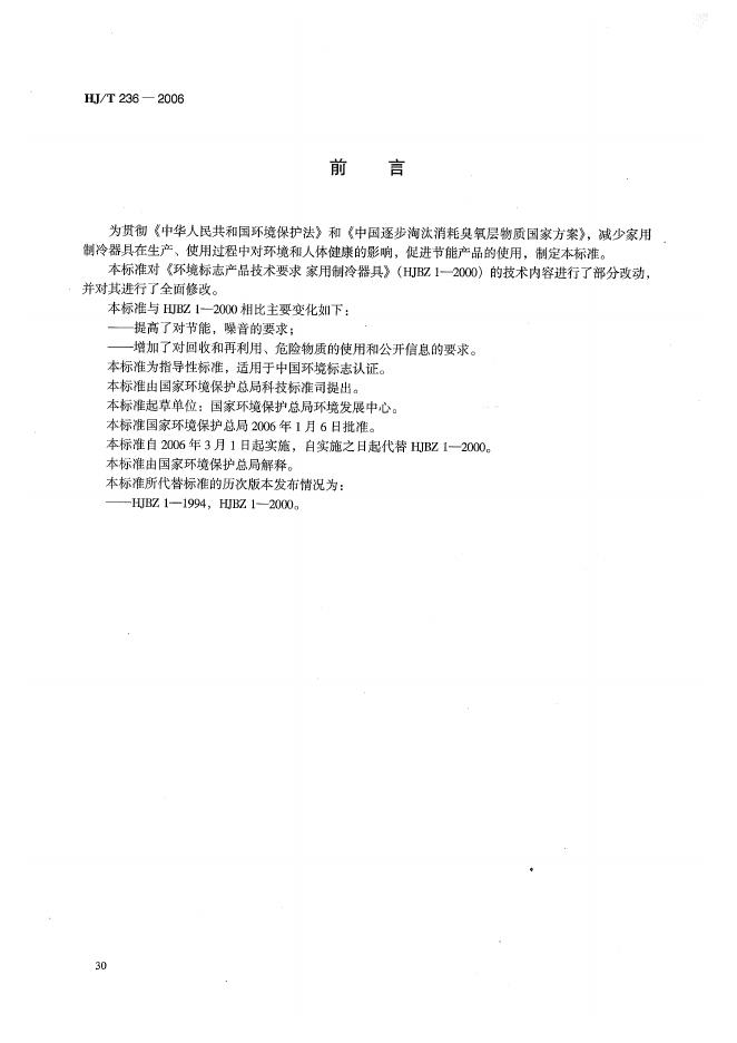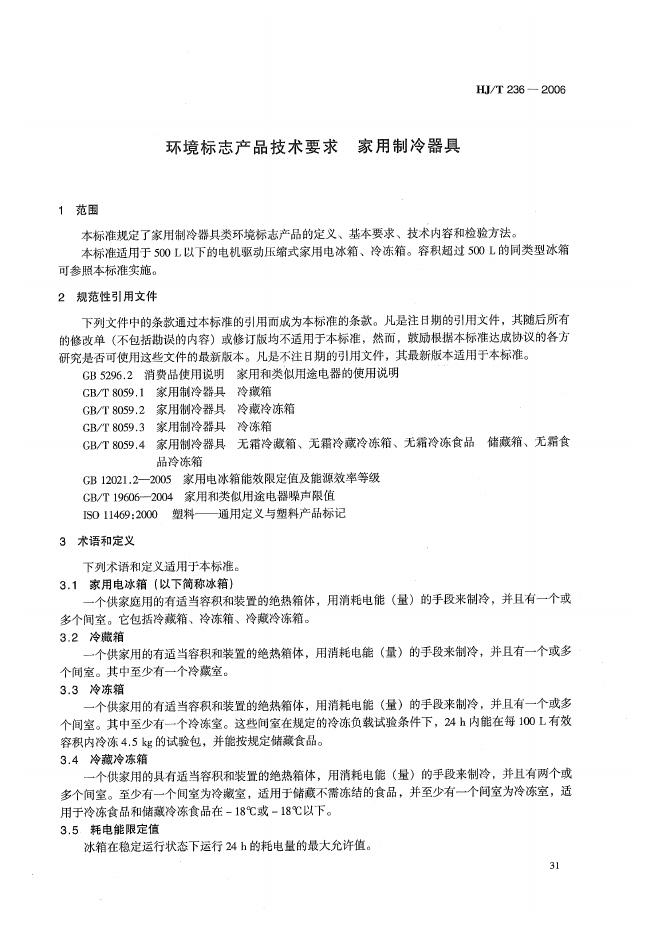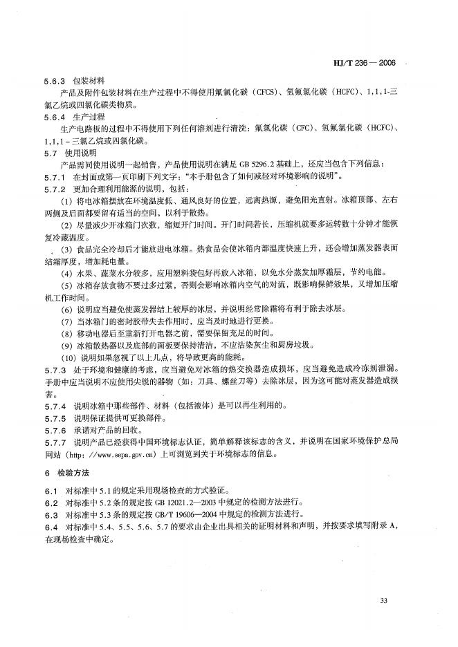HJ/T 236-2006 环境标志产品技术要求 家用制冷器具