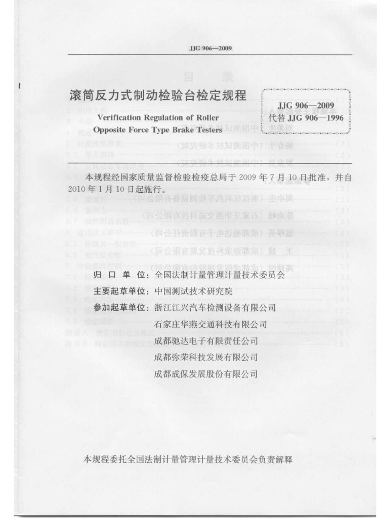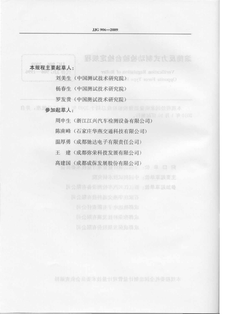 刘美生(中国测试技术研究院)、杨春生(中国测试技术研究院)、罗发贵(中国测试技术研究院)、周申生(浙江江兴汽车检测设备有限公司)、陈南峰(石家庄华燕交通科技有限公司)、温厚勇(成都驰达电子有限责任公司)、王建(成都弥荣科技发展有限公司)、高建国(成都成保发展股份有限公司)