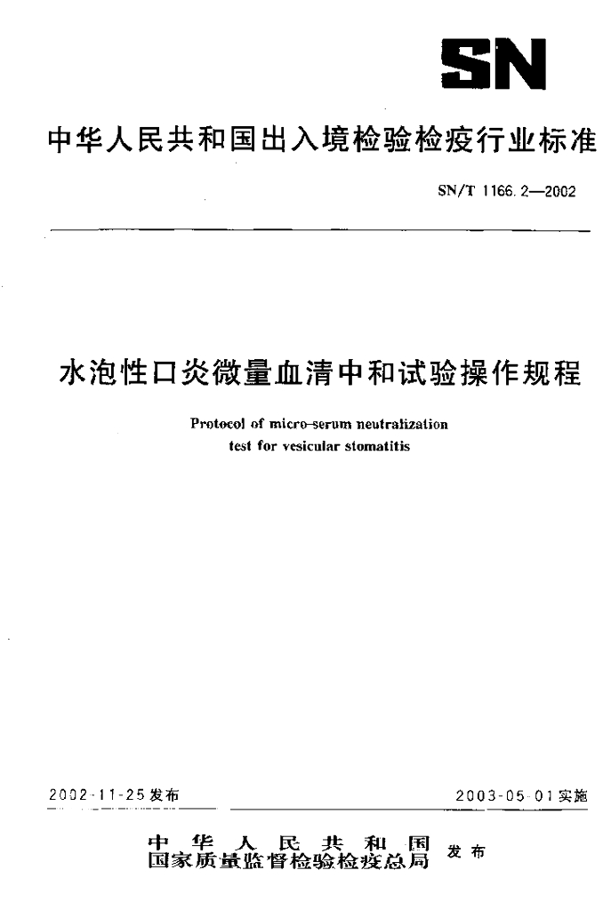 SN/T 1166.2-2002 水泡性口炎微量血清中和试验操作规程