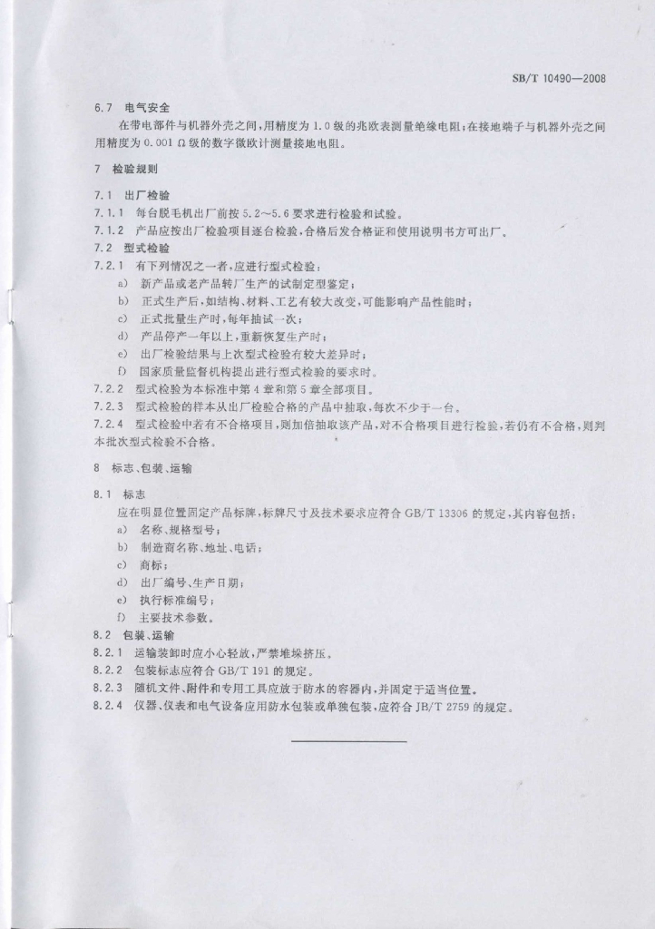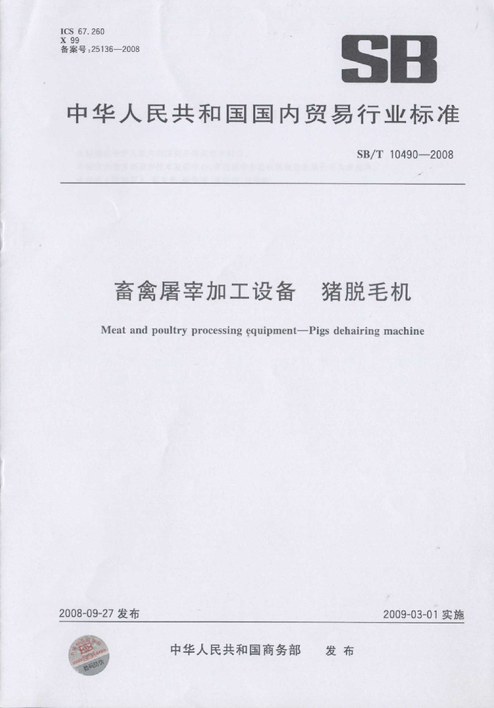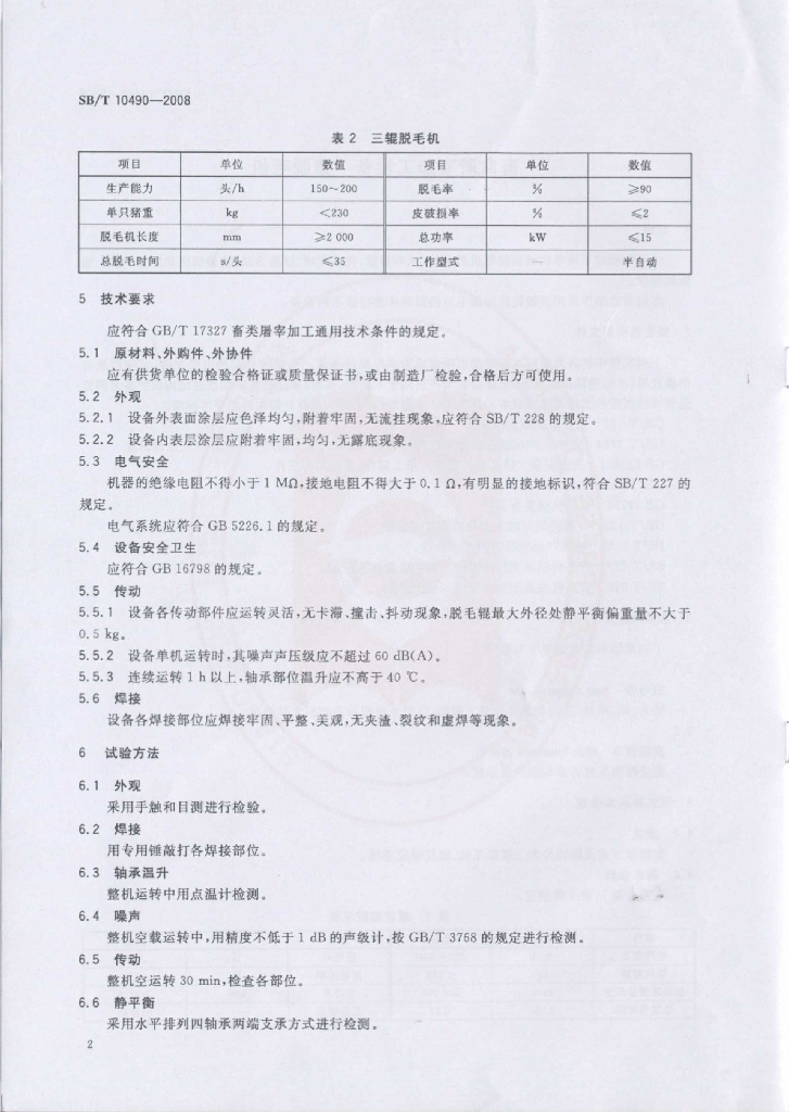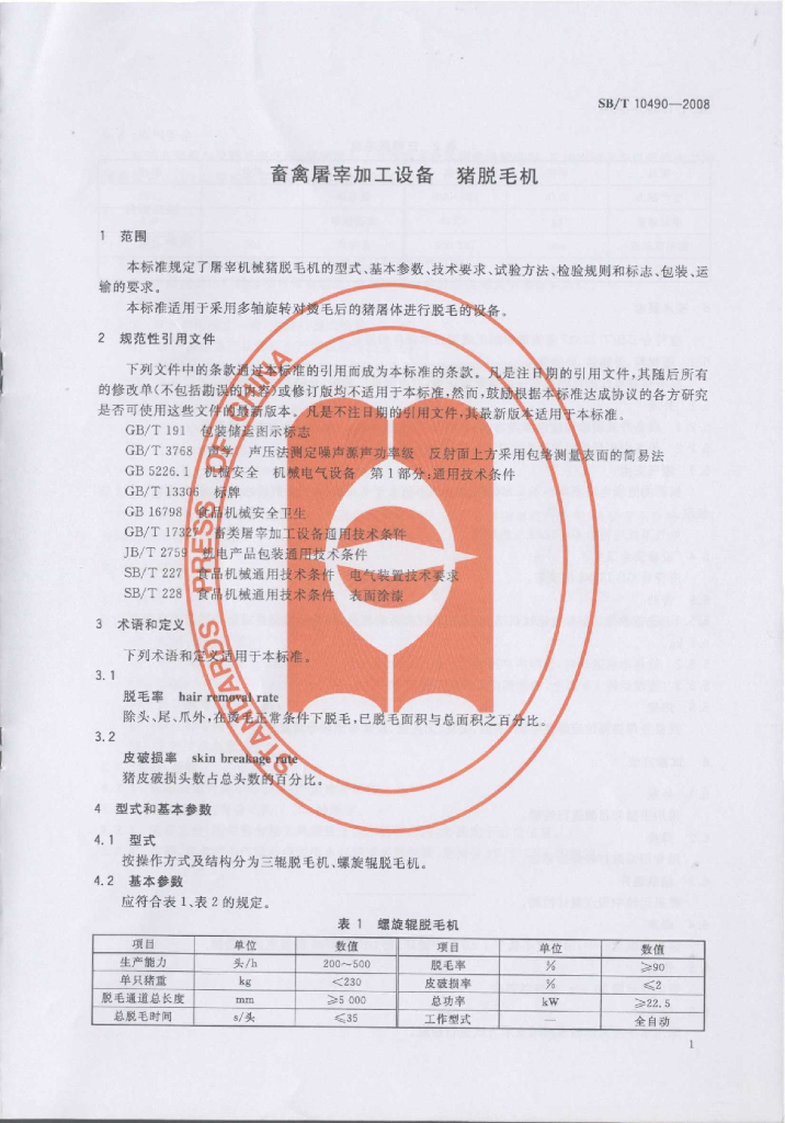 SB/T 10490-2008 畜禽屠宰加工设备 猪脱毛机