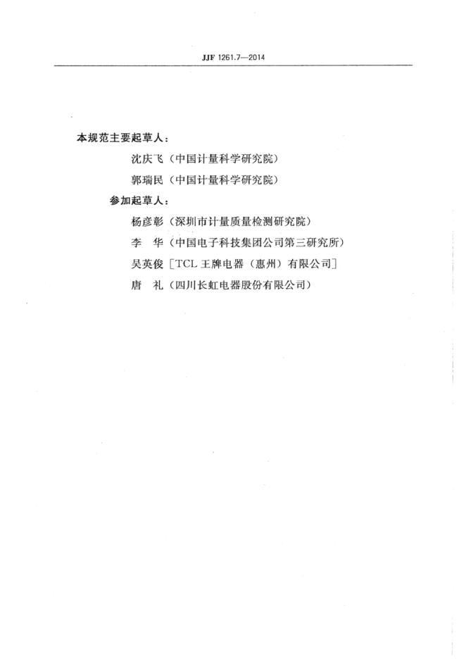 沈庆飞(中国计量科学研究院)、郭瑞民(中国计量科学研究院)、杨彦彰(深圳市计量质量检测研究院)、李华(中国电子科技集团公司第三研究所)、吴英俊(TCL王牌电器(惠州)有限公司)、唐礼(四川长虹电器股份有限公司)