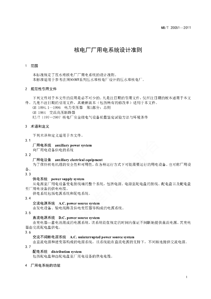 NB/T 20051-2011 核电厂厂用电系统设计准则