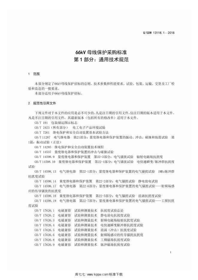 Q/GDW 13118.1-2018 66kV母线保护采购标准 第1部分:通用技术规范