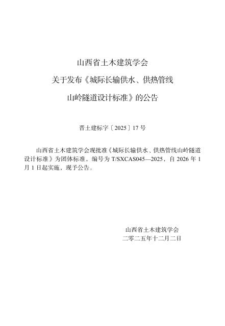 T/SXCAS 045-2025 城际长输供水、供热管线山岭隧道设计标准